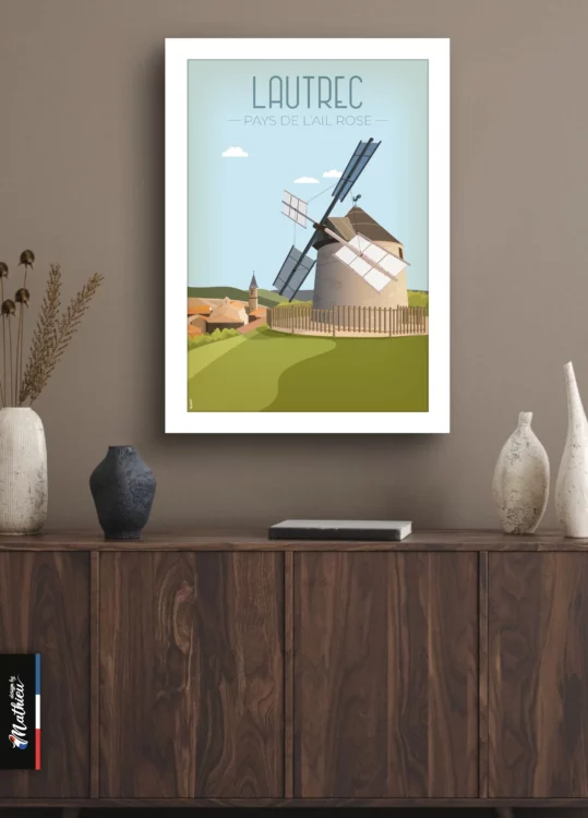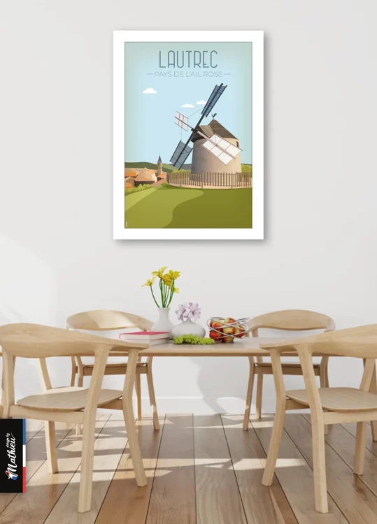 Le charme brut du Pays de l’Ail Rose. Cette affiche met en lumière le célèbre moulin de Lautrec, sentinelle d’un des Plus Beaux Villages de France. Des lignes douces et chaleureuses, parfaites pour apporter une touche d’authenticité tarnaise à votre intérieur, que ce soit pour votre propre décoration ou une belle idée cadeau.