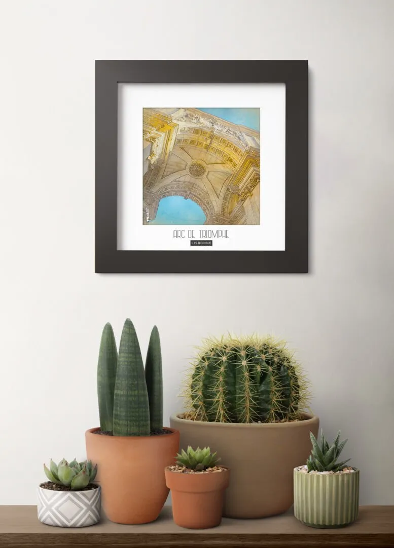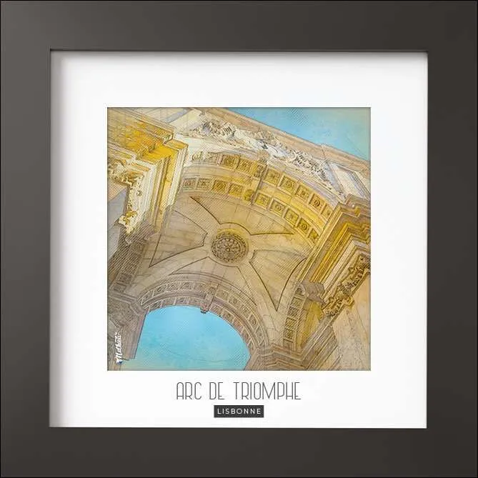 Magnifique photo de l’Arc de Triomphe (Lisbonne) au PORTUGAL, sublimée dans un cadre en bois noir mat de forme carré pour votre intérieur.