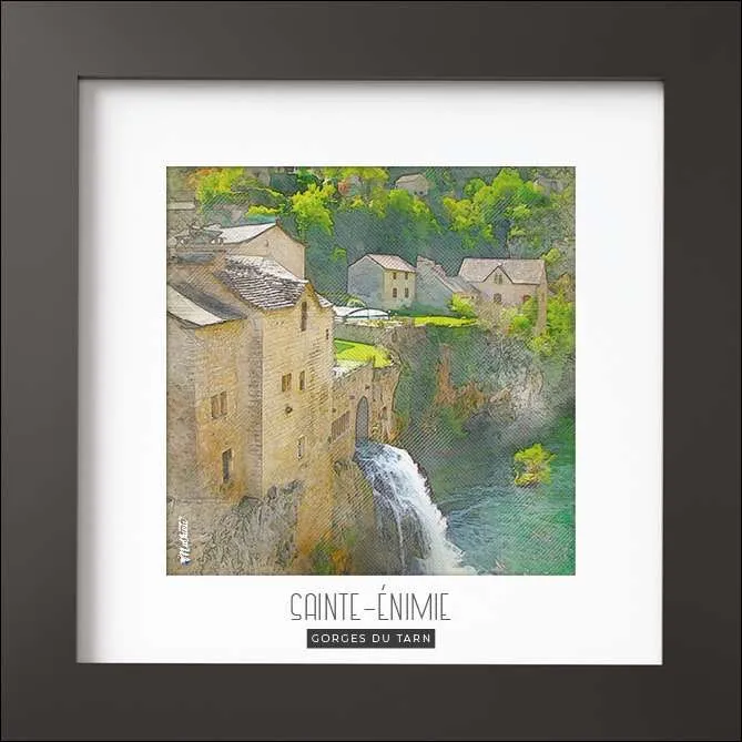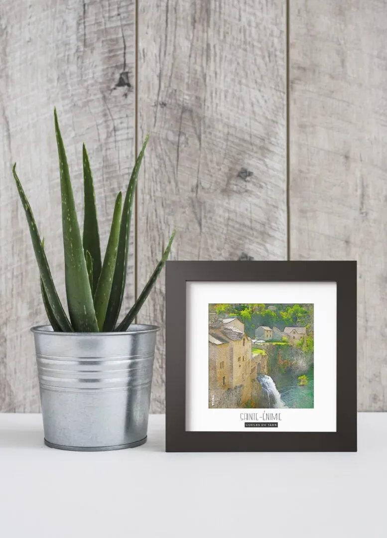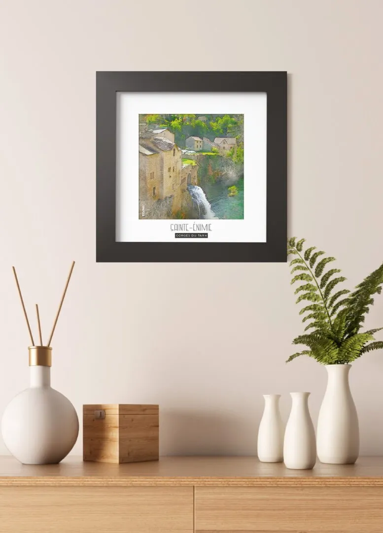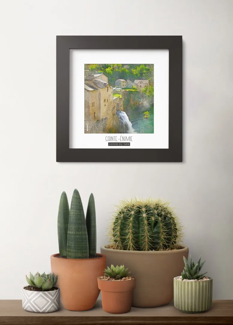 Magnifique photo du village de Sainte-Énimie (Gorges du Tarn) (FRANCE), sublimée dans un cadre en bois noir mat de forme carré pour votre intérieur.