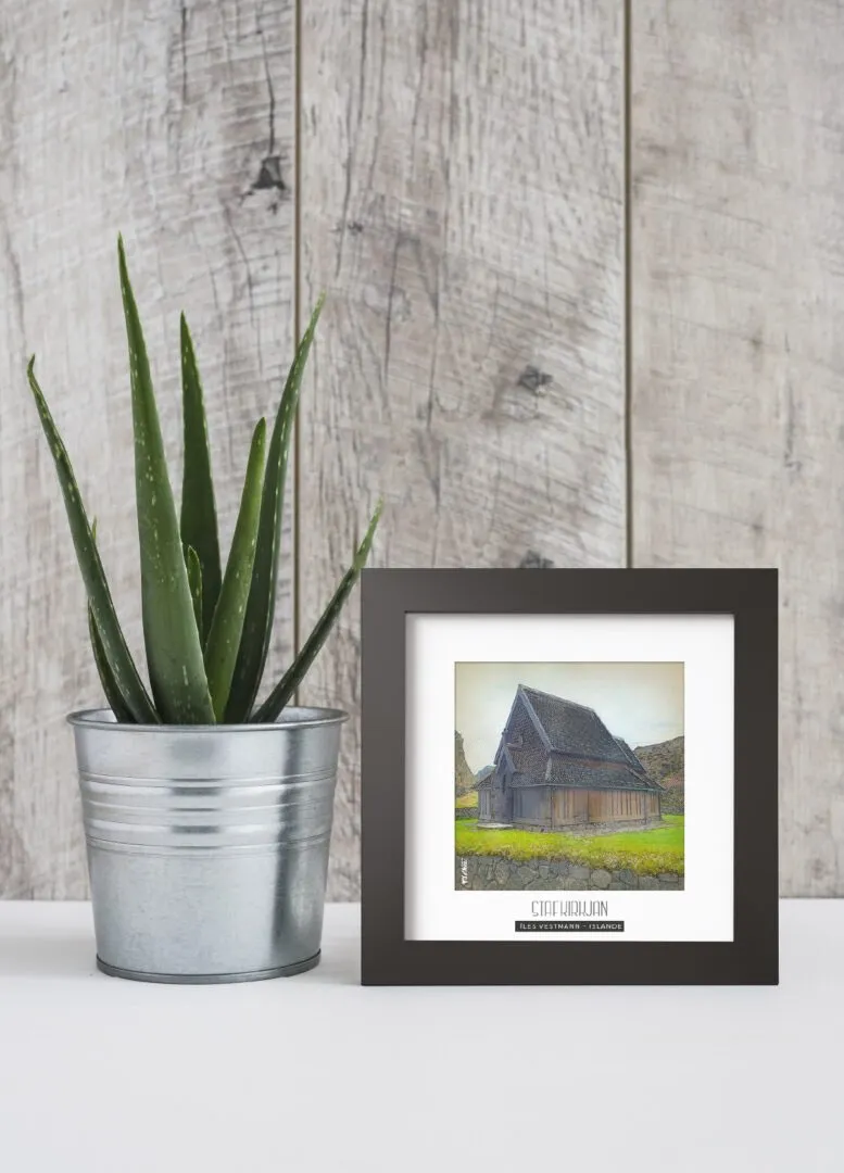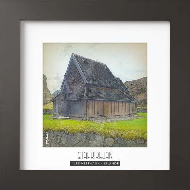 Magnifique photo de La Chapelle de Stafkirjan (Îles Vestmann – Islande) sublimée dans un cadre en bois noir mat de forme carré pour votre intérieur.