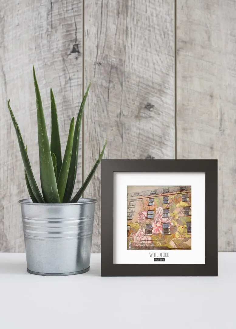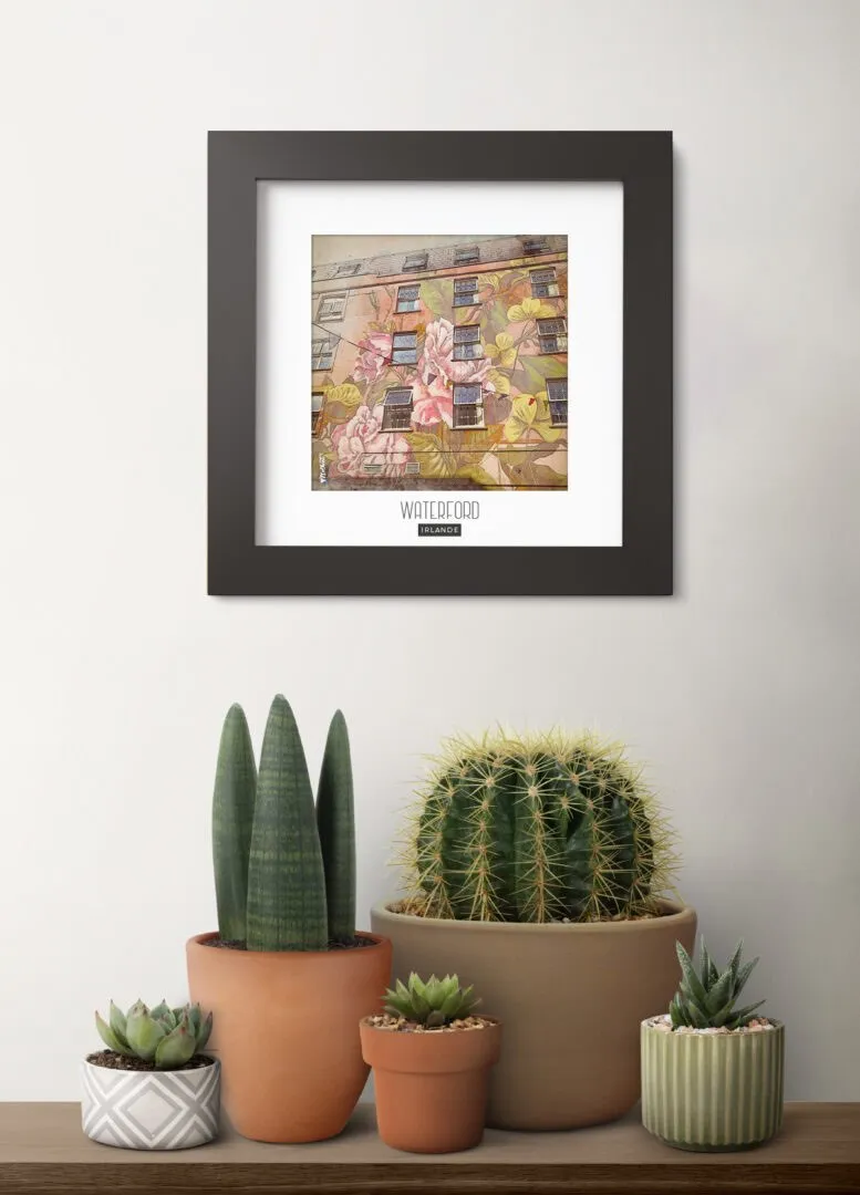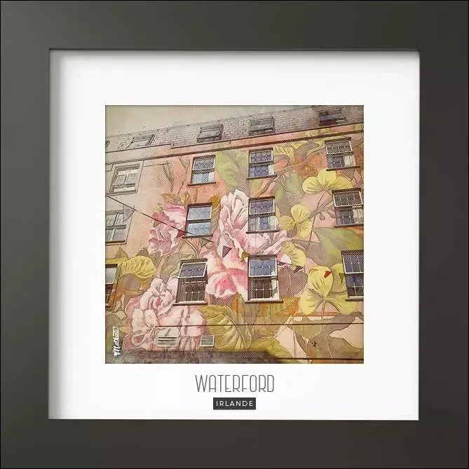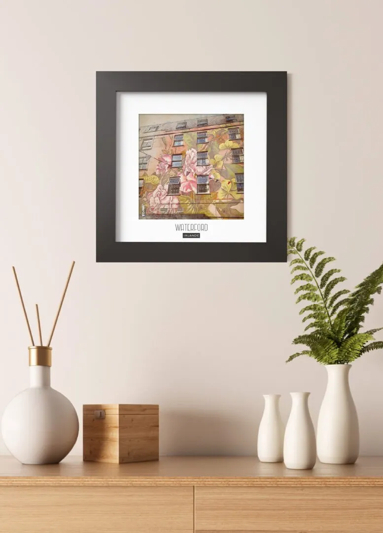 Magnifique photo d’un TAG sur une façade de maison dans la ville de Waterford (Irlande), sublimée dans un cadre en bois noir mat de forme carré pour votre intérieur.