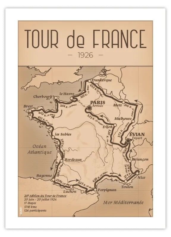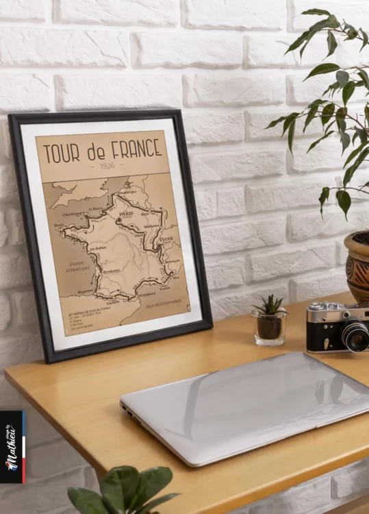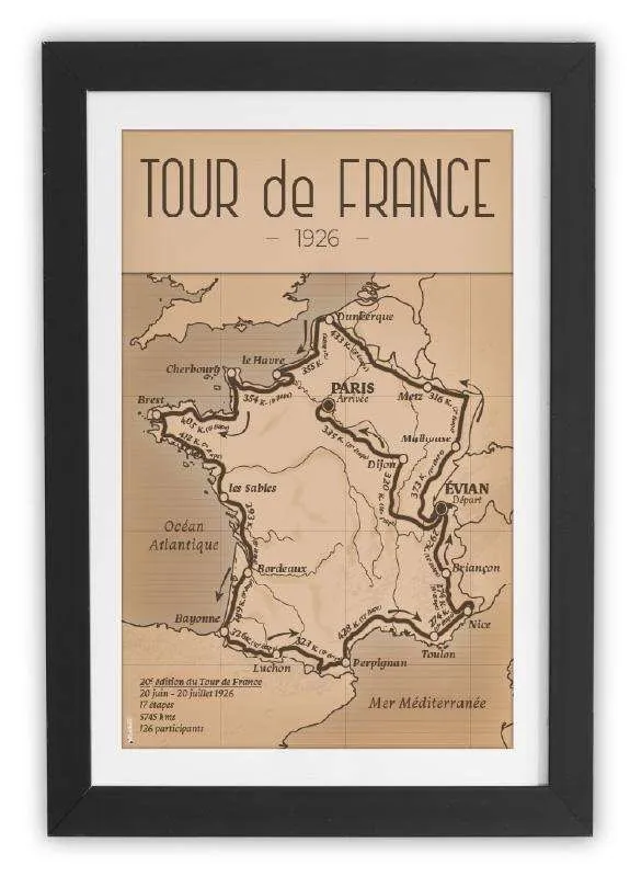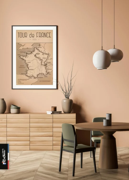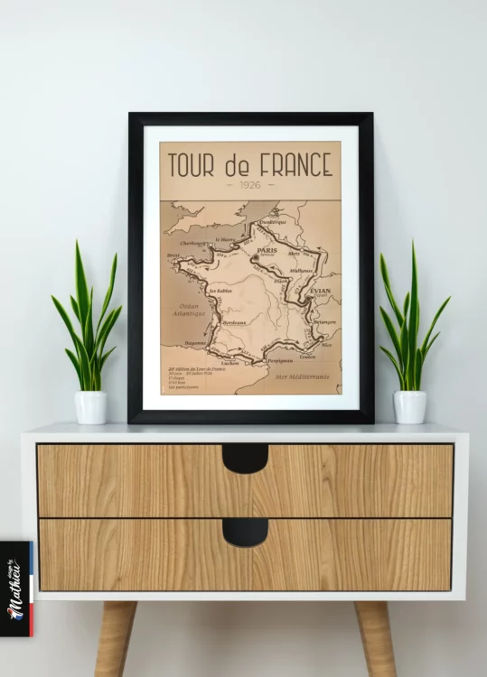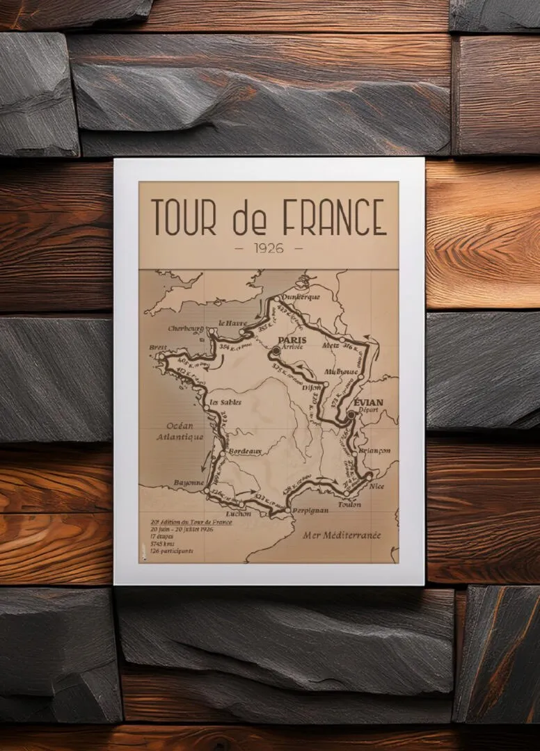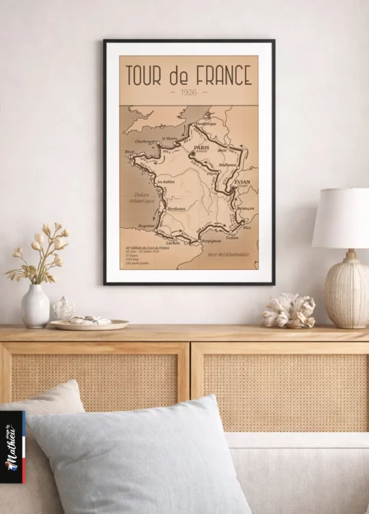 Le Tour de France 1926, la 20ᵉ édition de cette compétition légendaire, s’est déroulé du 20 juin au 20 juillet 1926. Avec 17 étapes totalisant 5 745 km, il demeure à ce jour le plus long Tour de l’histoire. Cette édition est également marquée par un départ inédit depuis Évian-les-Bains, rompant ainsi avec la tradition du départ depuis la capitale. Intégrer cette affiche dans votre décoration intérieure, c’est non seulement célébrer un moment emblématique du cyclisme, mais aussi adopter une tendance déco qui valorise les pièces artisanales et l’histoire. Les couleurs riches et les motifs historiques de l’affiche s’harmonisent parfaitement avec les tendances actuelles, telles que l’utilisation de matériaux naturels et l’intégration d’éléments vintage dans les espaces de vie. Offrez à votre intérieur une pièce unique qui allie histoire, art et tendance, et laissez cette affiche du Tour de France 1926 devenir le point focal de votre décoration.